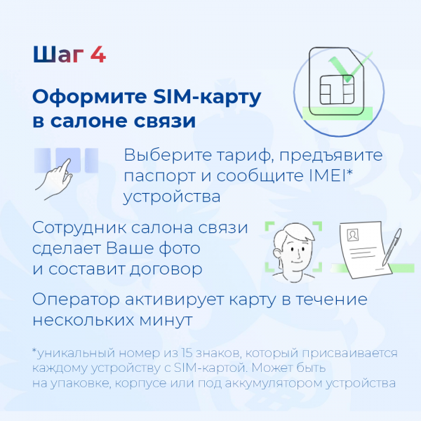 В договоре будет указан IMEI — код идентификации устройства, в которое будет устанавливаться сим-карта.