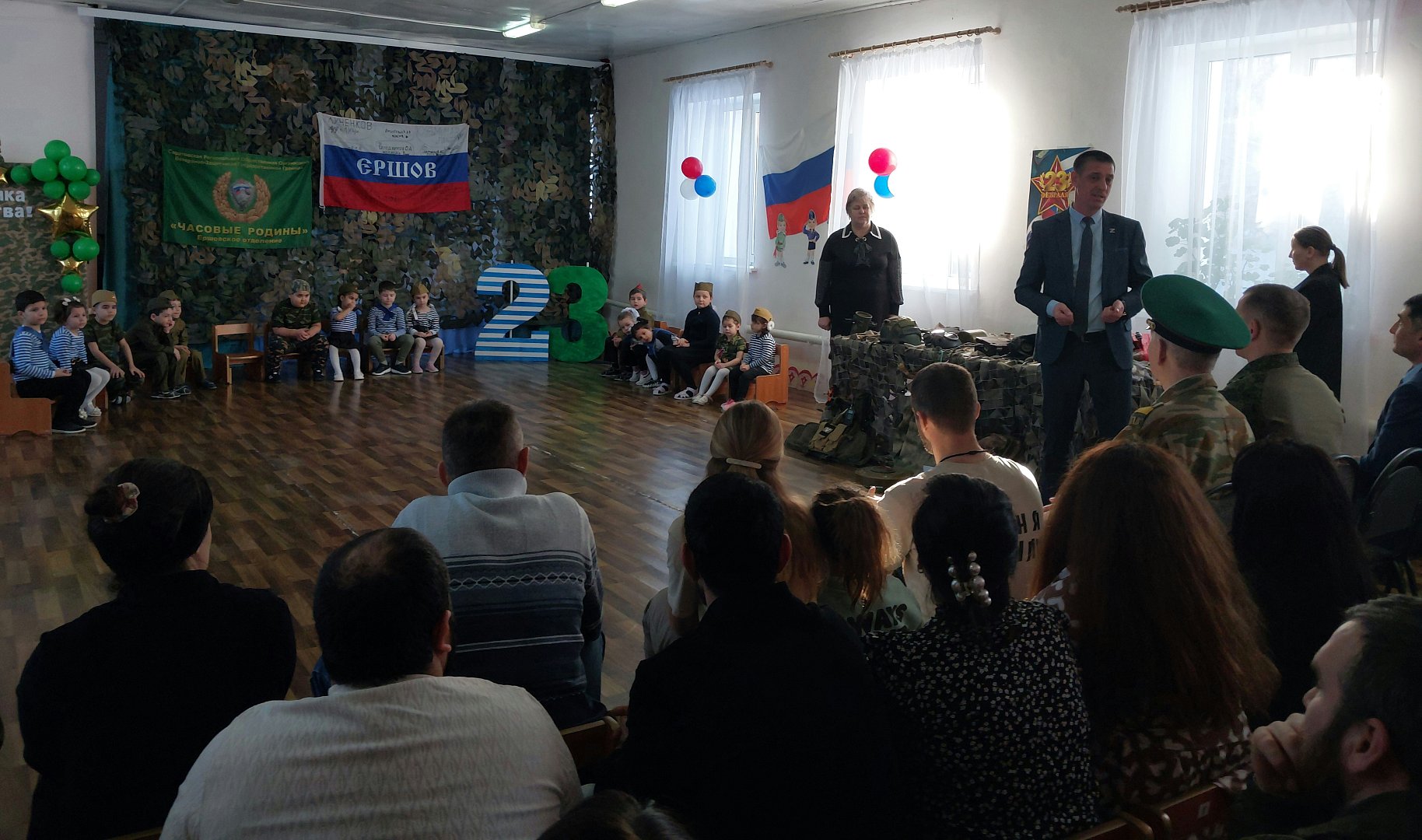 На мероприятие были приглашены почетные гости: первый заместитель главы администрации Ершовского района по социальным вопросам, начальник отдела образования Владимир Терещенко, председатель Ершовского отделения региональной общественной организации ветеранов-защитников «Часовые Родины» Николай Садко, представители общественных организаций «Броня в тылу» и «Совет отцов», участник специальной военной операции с позывным «Гугл», родители воспитанников.