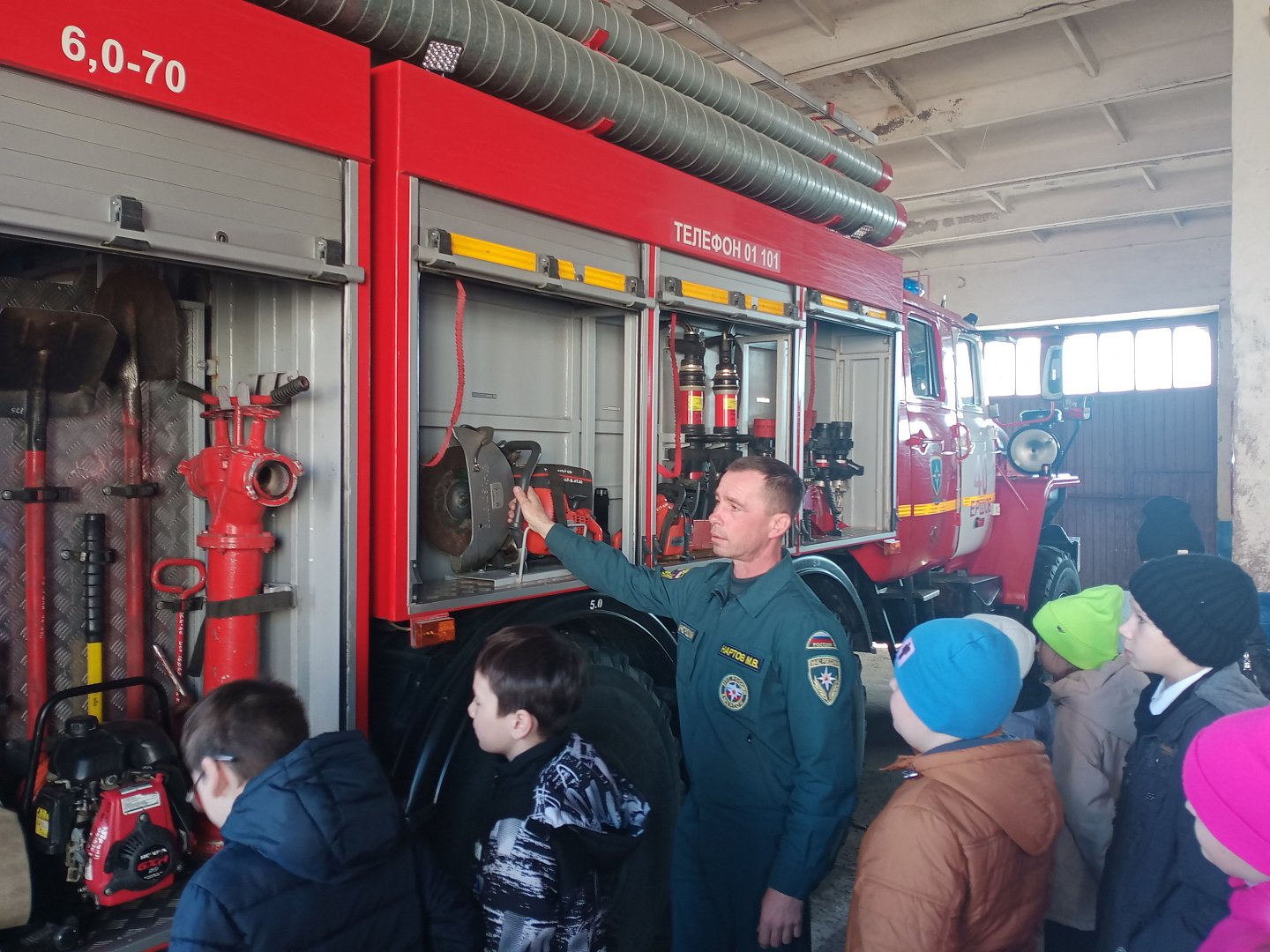 Начальник караула Михаил Нартов познакомил ребят со специальной одеждой пожарного, продемонстрировал работу пожарной автолестницы, рассказал о том, каким образом происходит подача огнетушащих средств к условному очагу. Ребята побывали в кабине пожарной машины, проверили работу ее сигнального устройства, познакомились с работой диспетчера, побывали в комнате отдыха пожарных и учебном классе.