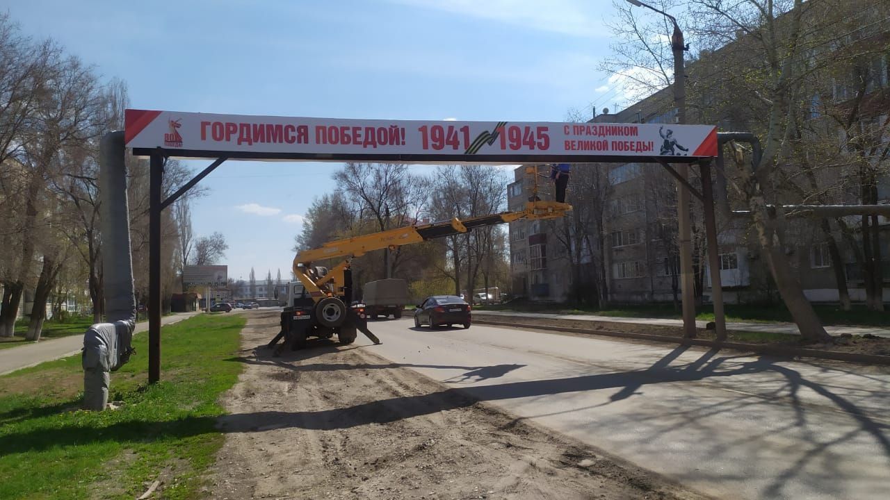 В преддверии важнейшего для всей нашей страны события — празднования 80-летия Великой Победы — в Ершове также идет усиленная подготовка к празднику 9 Мая. МКУ "Благоустройство" активно проводит работы по украшению облика города. На днях на улице Юбилейной установлена металлическая конструкция с баннером, посвященным великому празднику.