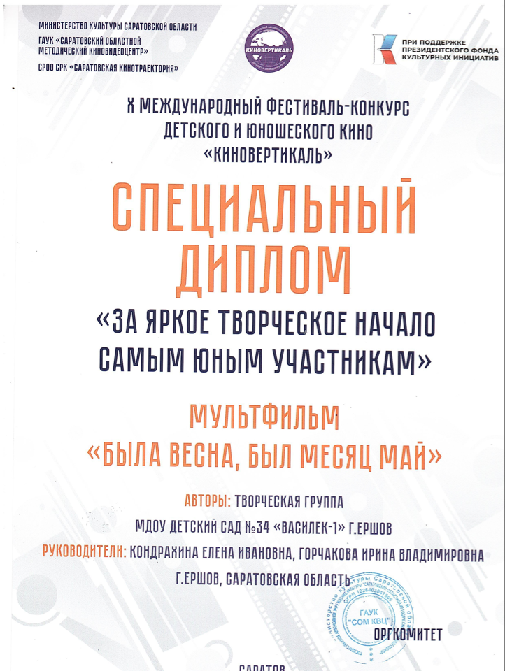 Ранее, в 2023 году, воспитанники детсада уже участвовали в X «Киновертикали» и получили специальный диплом «За яркое творческое начало самым юным участникам» за мультфильм «Была весна, был месяц май».