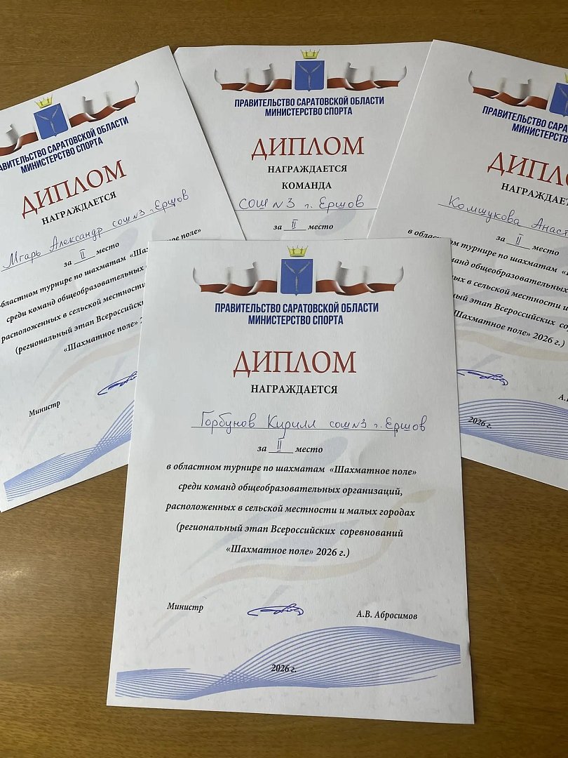 В турнире «Шахматное поле» (категория 5–7 классы, соревновались 4 команды) ершовская команда в составе Александра Мгарь, Кирилла Горбунова, Владимира Белова и Анастасии Комшуковой завоевала 2‑е место на региональном этапе — это настоящий успех и повод для гордости. Шахматисты проявили выдержку в напряжённых партиях, смогли собраться в ключевые моменты и принести команде заслуженное «серебро».