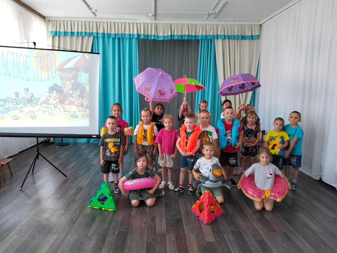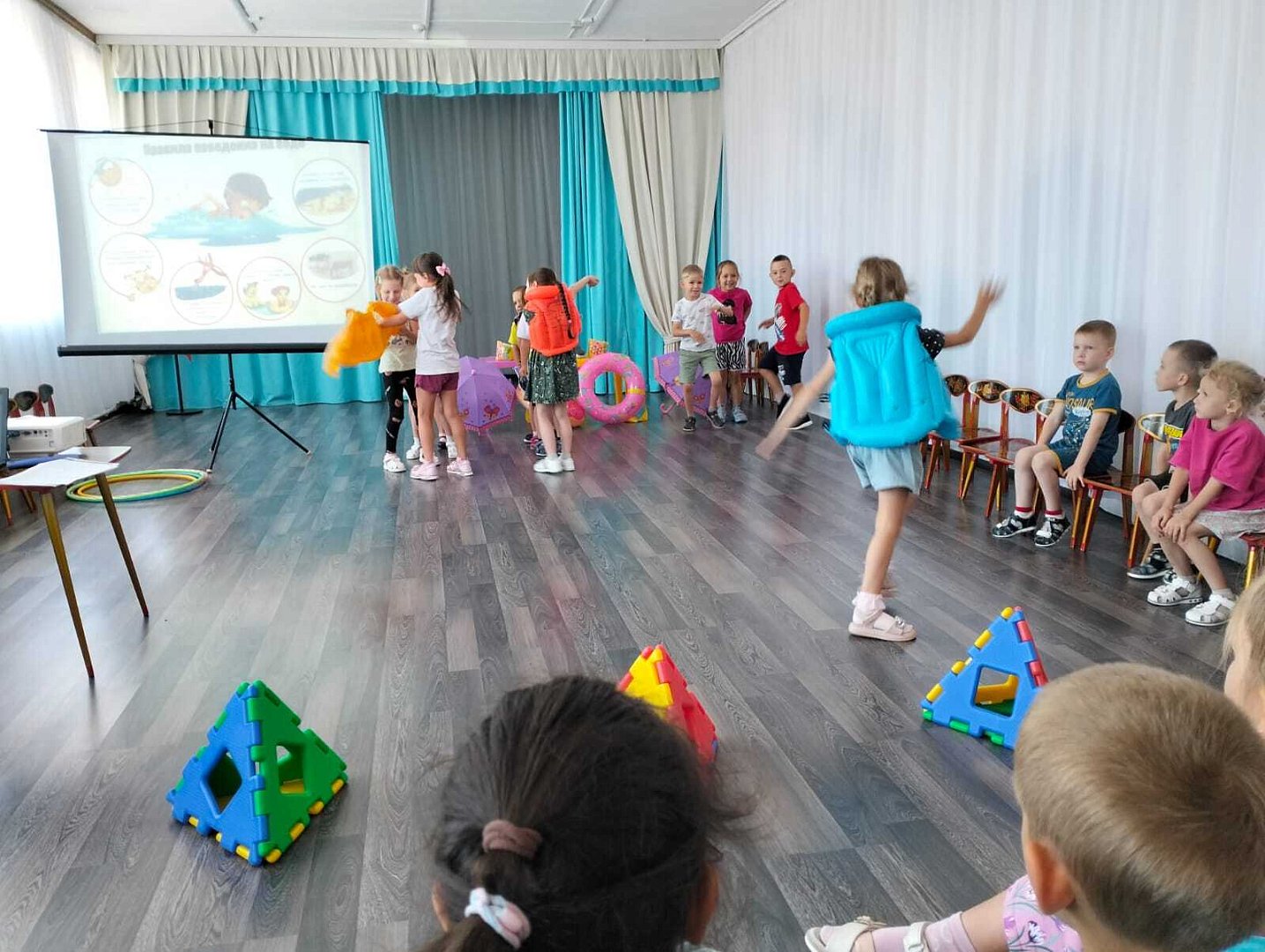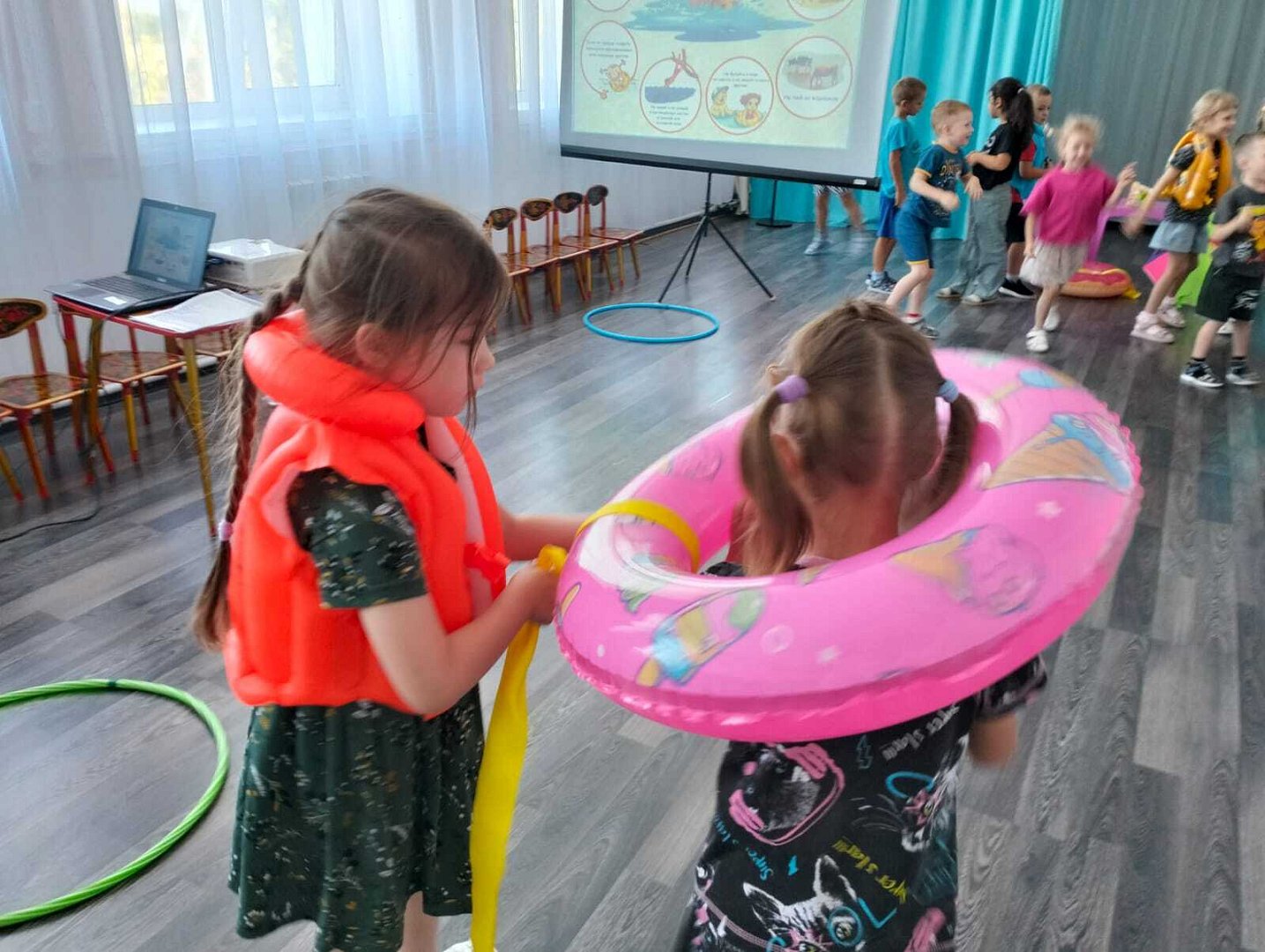 Посмотрев презентацию «Правила безопасного поведения на воде», ребята вспомнили, как нужно вести себя у воды. Также дошколята узнали о предметах-помощниках, которые нужны для спасения утопающего: спасательный круг, жилет и веревка. Особый интерес у детсадовцев вызвал процесс проверки надувных кругов, один из которых оказался поврежденным и сдувался. Дети сделали вывод: использовать можно только исправные плавательные средства.