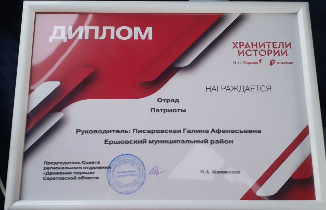 30 сентября отряд Хранителей истории школы №5 г.Ершова: Ренат Унайбеков, Матвей Прохоров, Мария Харькова, Арина Мусякаева, Ева Яшкина под руководством наставника Галины Писаревской посетил торжественное посвящение участников Движения Первых Саратовской области в Хранители истории, которое проходило в Саратовском военном ордена Жукова Краснознаменном институте войск национальной гвардии Российской Федерации.