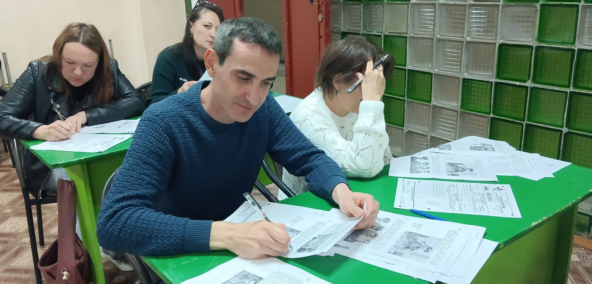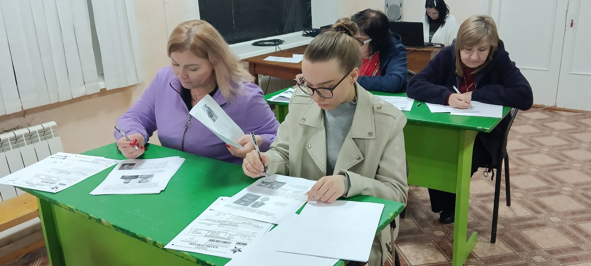 Одной из площадок в Ершове, где прошла акция, и на которой мы побывали, стал районный Дом культуры. Проверить свои знания о героическом прошлом нашей страны собрались работники учреждений культуры Ершовского МР. Куратор площадки - директор РДК Любовь Зинковская. В качестве волонтеров, которые подробно рассказали о правилах написания диктанта, выступили Светлана Бутенко, заведующая методическим отделом РДК, и Елена Коровяковская, хранитель музейных ценностей районного историко-краеведческого музея.
