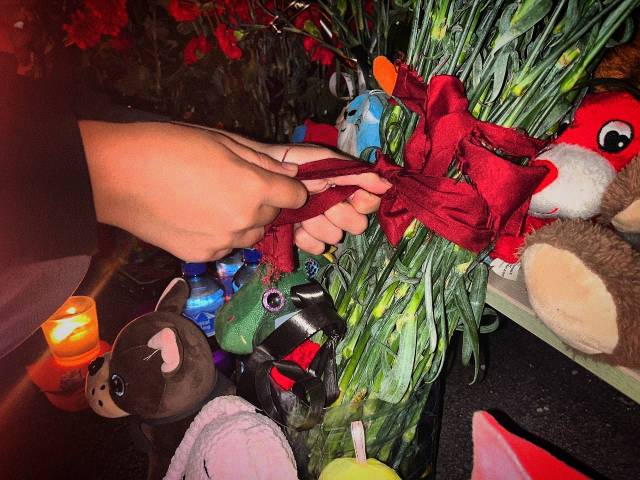 После возложения, активисты обвязали цветы у мемориала красными лентами – в знак того, что вместе с этими цветами они оставляют частицу себя, свою поддержку, боль и надежду, прожитую в эти тяжёлые дни.