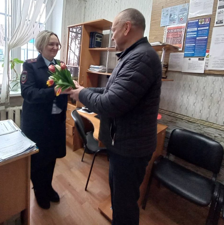 В преддверии 8 Марта общественник в первую очередь поздравил Елену Анатольевну с наступающим праздником, пожелал крепкого здоровья, весеннего настроения и профессиональных успехов в нелегкой службе.