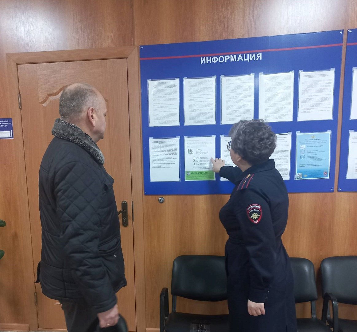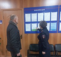 Визит начался с проверки работы кнопки вызова сотрудников и осмотра пандусов, необходимых для обеспечения доступа маломобильных граждан. На звонок оперативно отреагировала старший инспектор ОВМ младший лейтенант полиции Динара Плетнева, которая проводила общественника в здание и подробно ответила на все вопросы, касающиеся проверки. Далее общественник осмотрел стенды со справочной информацией, убедился в наличии информации об оказании «Госуслуг» и контактных телефонов подразделения.