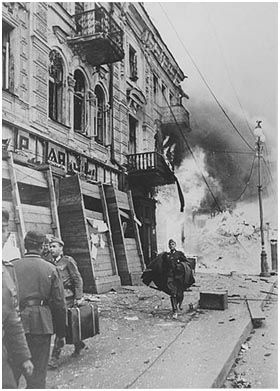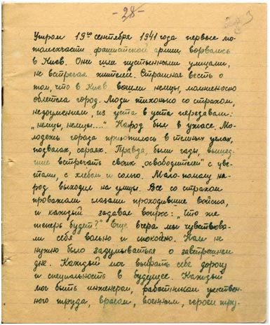 …Красная армия подошла к Киеву. …Жандармы с помощью оружия и плетей сгоняли народ на вокзал, но народ не шел. Прятался в подвалах, погребах, на чердаках. Так погибли десятки мирного населения… Фашисты жгли Киев…»