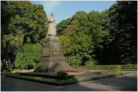 Памятник на месте захоронения генерала Н. Ф. Ватутинав Мариинском парке г. Киева с надписью на постаменте: «Генералу Ватутину от украинского народа». Установлен