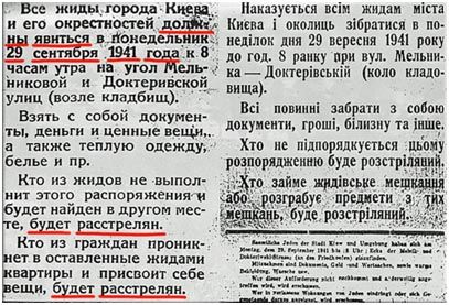 …предлагалось всем евреям города и его окрестностей явиться на Лукьяновское кладбище к Бабьему Яру со своими семьями, документами и своими наилучшими вещами.