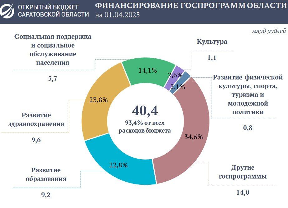На финансирование 20 государственных программ Саратовской области за три месяца 2025 года направлено 40,4 млрд рублей, или 93,4% от совокупных расходов областного бюджета.