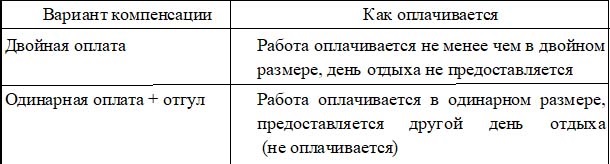 По желанию работника вместо двойной оплаты ему может быть предоставлен другой день отдыха — тогда работа оплачивается в одинарном размере, а день отдыха оплате не подлежит.