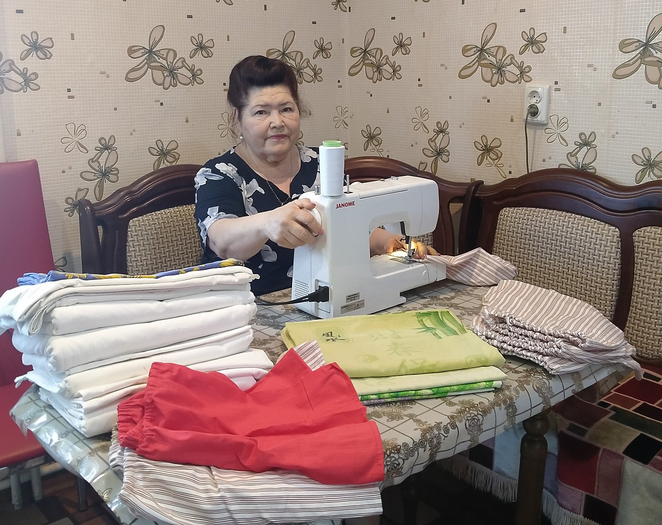 Из ткани, предоставленной получателями социальных услуг, Роза Константиновна сшила для отправки «за ленточку» 24 предмета постельного белья и 26 предметов нижнего белья. «Рада, что мои навыки в швейном деле пригодились в таком нужном общем деле», - сказала она.