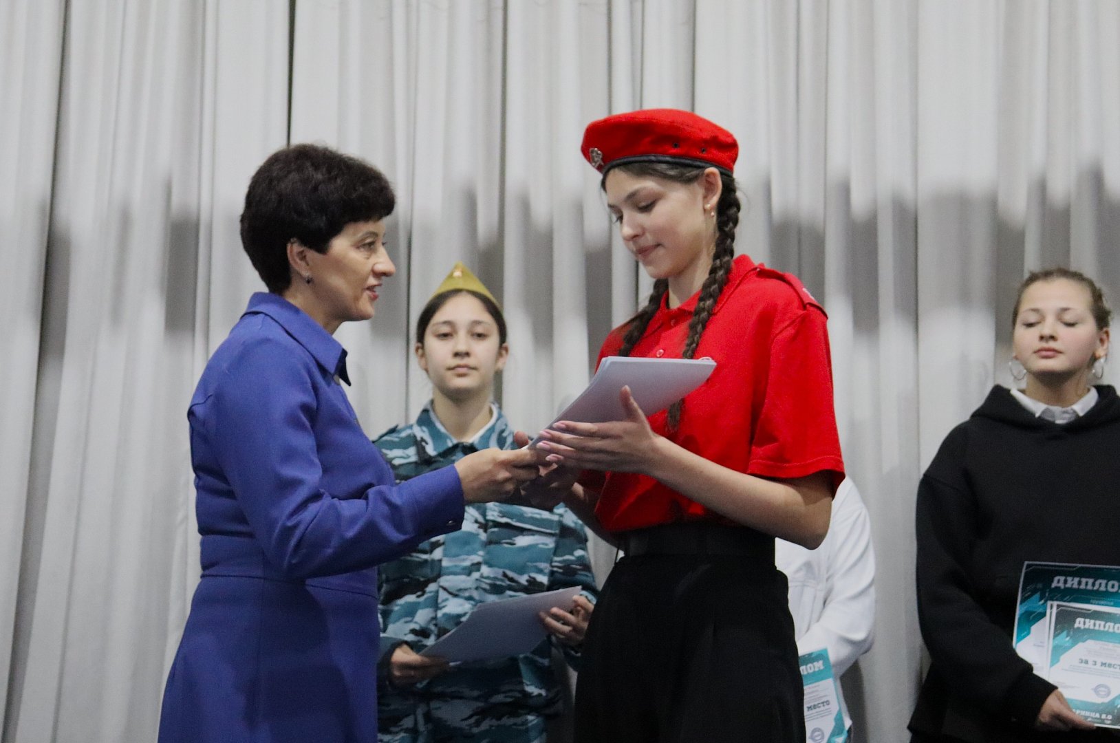 Марина Марина, председатель совета местного отделения Движения Первых, вручила заслуженные награды юнармейцам старшей возрастной категории: