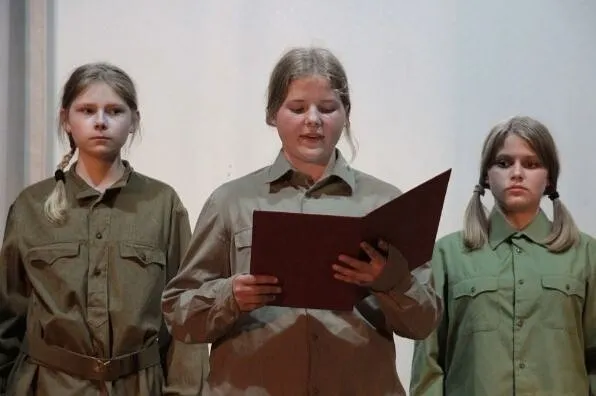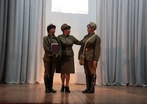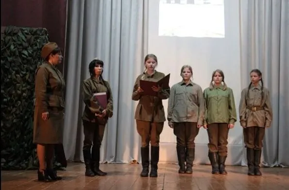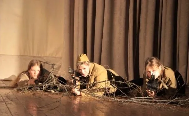 В начале показа жительница села Надежда Курскова прочитала авторское стихотворение «Нас память зовет…», после чего начался спектакль, который с самых первых минут захватил зрителей. В постановке совместно принимали участие два театральных коллектива - детский «Непоседы» и взрослый «Иван да Марья». Юные артисты Виктория Никифорова, Соня Степаненко, Варвара Ильина, София Парчевская исполнили роли курсантов школы. Участники старшего коллектива сыграли роли: полковник Алдонина – Ольга Слезкина, командира отряда лейтенант Сизова – Виктория Санкеева, инструктор школы старшина Морозова – Любовь Телятова.
