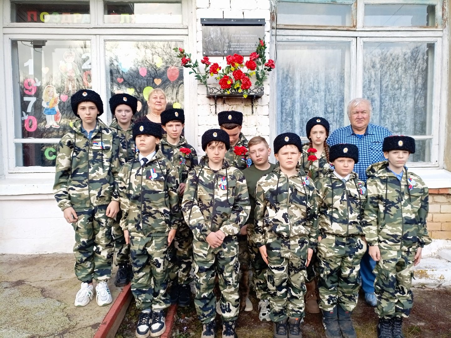Завершилось мероприятие общей фотографией и возложением цветов к мемориальной доске Панина Андрея.