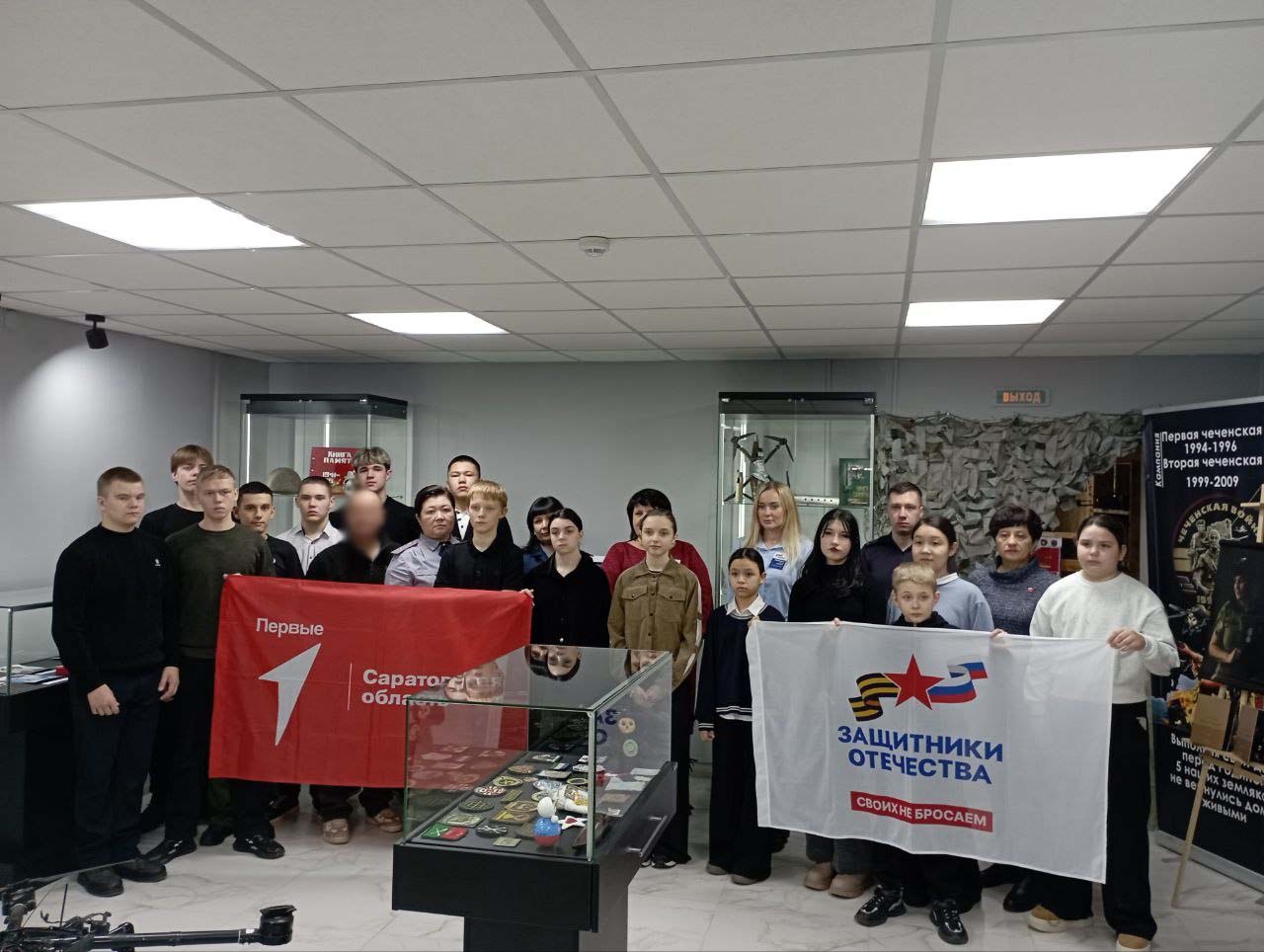 В зале Ершовского историко-краеведческого музея «Музей героев СВО. На переломе эпох» состоялась встреча участников Движения Первых с участником СВО с позывным «Фермер», награжденным медалью «За отвагу».