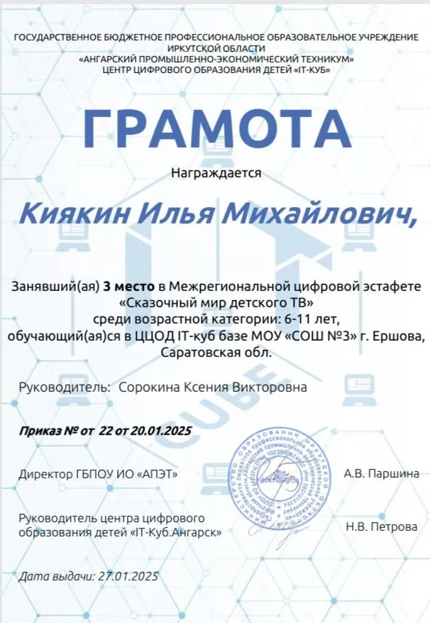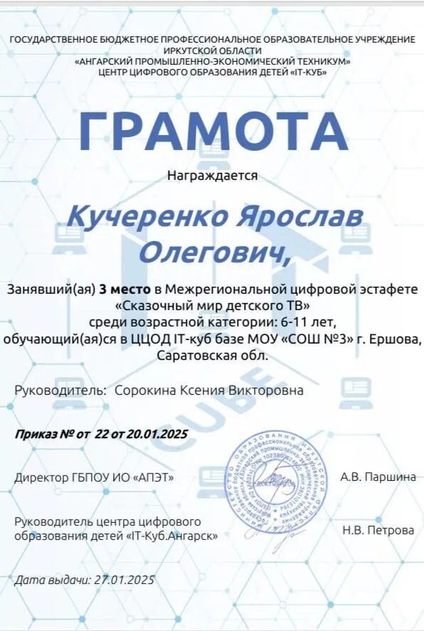 Юные эрудиты со всей страны продемонстрировали свои знания и любовь к миру мультфильмов. Организатором этой увлекательной битвы умов стал центр цифрового образования детей ITсube-38 г.Ангарск ГБПОУ ИО «АПЭТ», а посвящена эстафета была Дню рождения детского телевидения в России.