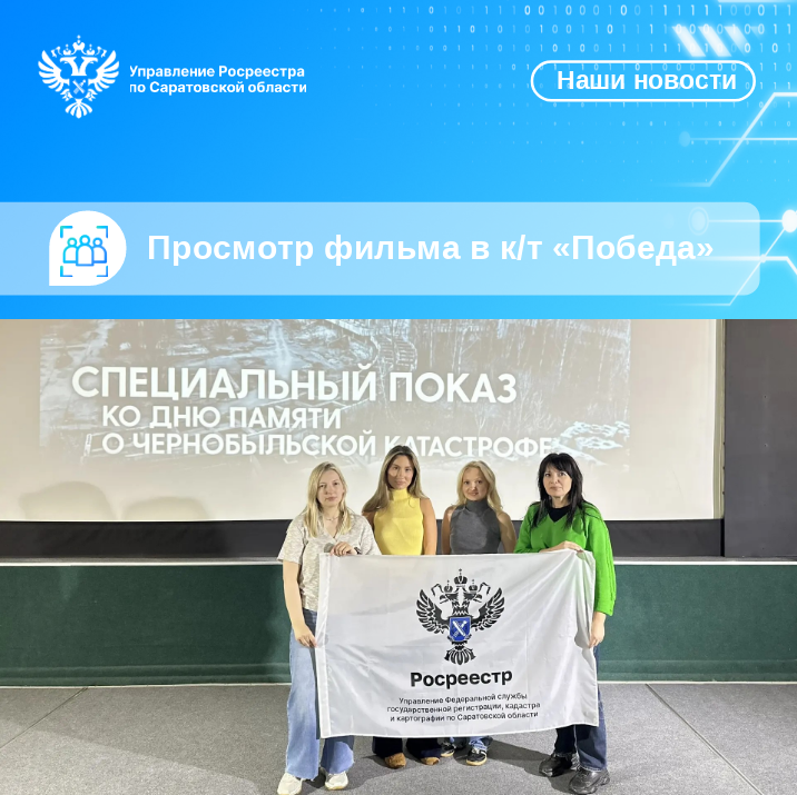 Сотрудники саратовского Росреестра приняли участие в мероприятии, организованном Агентством по управлению и использованию памятников истории и культуры в кинотеатре «Победа». Оно было посвящено 40-летию со дня взрыва на четвёртом энергоблоке Чернобыльской атомной электростанции. Вместе с коллегами из регионального Роскадастра, Росимущества и Социального фонда они посмотрели художественный фильм об аварии на АЭС, «Комиссия по расследованию».
