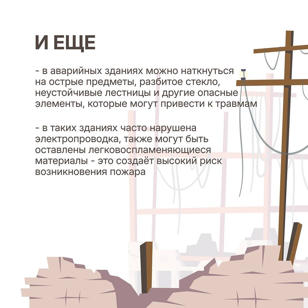 Кроме этого, в аварийных зданиях есть риск наткнуться на острые предметы, разбитое стекло, также к травмам могут привести неустойчивые лестницы, обветшавшие полы.