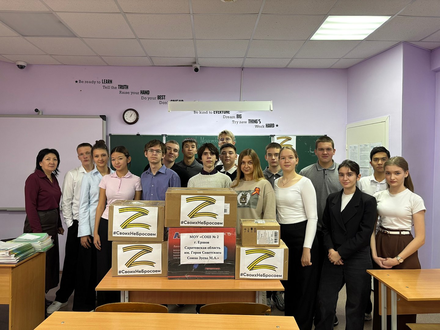 В рамках патриотического воспитания десятиклассники школы №2 г.Ершова собрали гуманитарную помощь военнослужащим, которые участвуют в специальной военной операции.