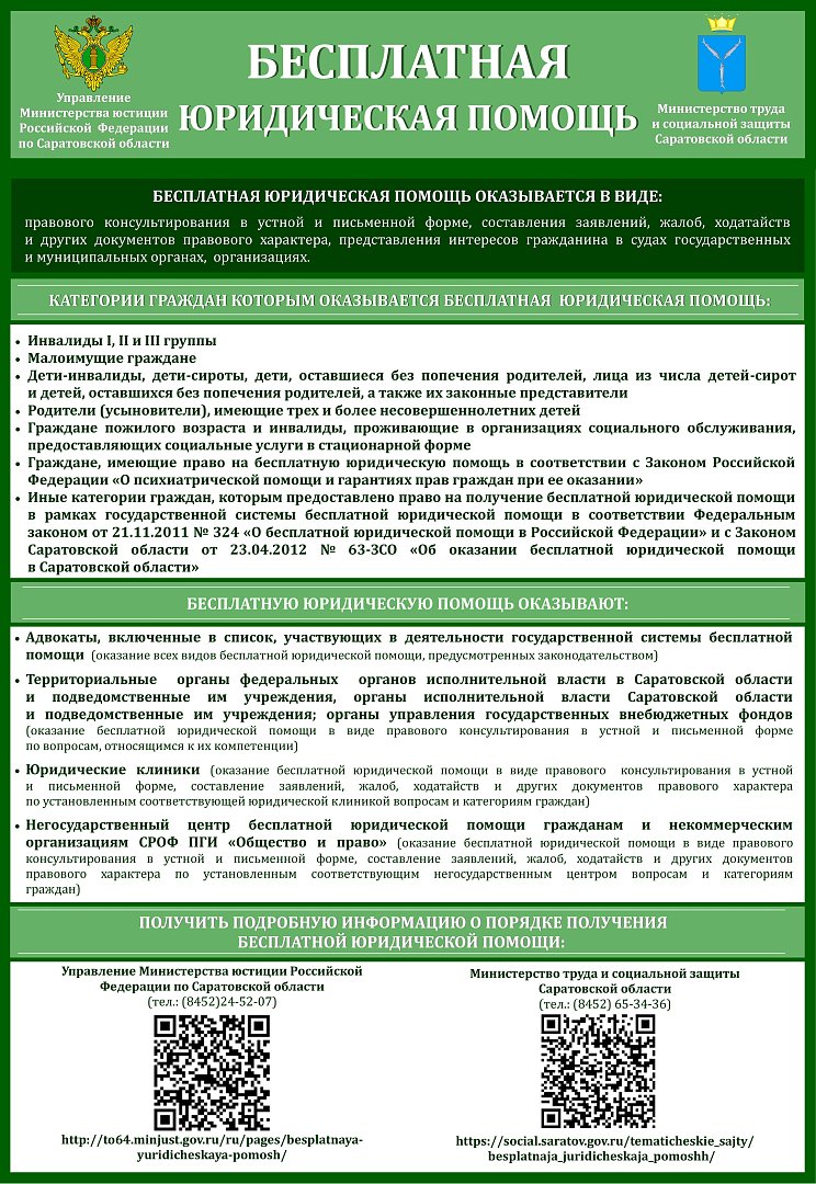 Управление Министерства юстиции РФ по Саратовской области информирует об условиях оказания бесплатной юридической помощи. В частности, в обращении перечислены категории граждан, которым такая помощь должна оказываться в соответствии с законодательством. Кроме того, также перечислены организации и специалисты, которые оказывают данную услугу.