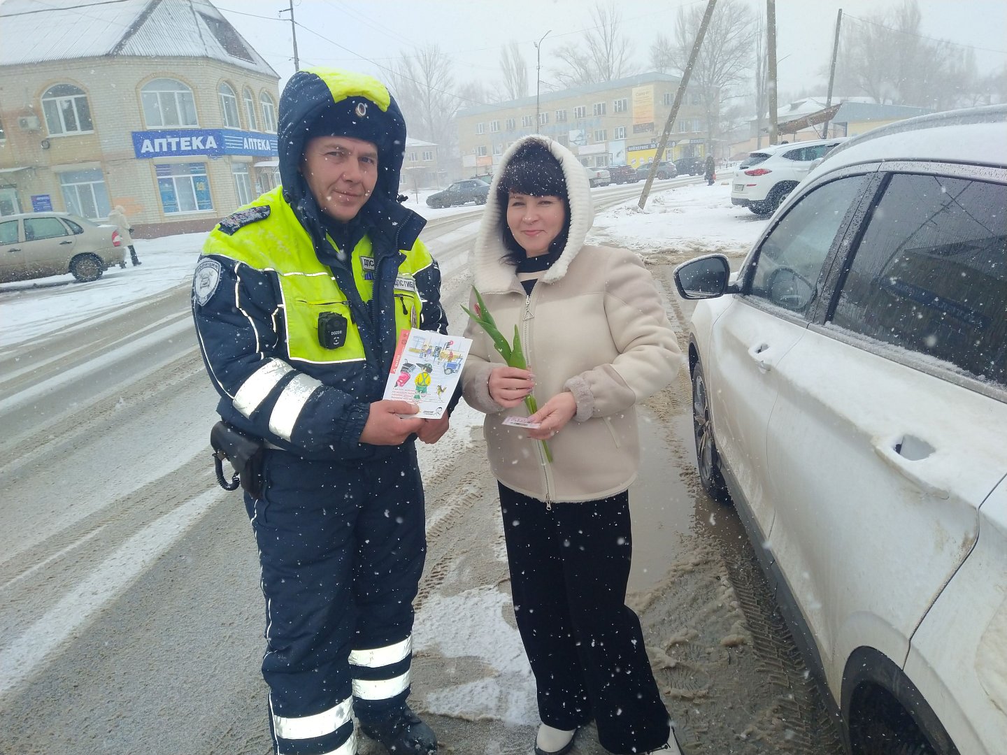 Вместе с цветами милые дамы получали памятки о соблюдении Правил дорожного движения, ведь их дома ждут дети, родные и близкие.