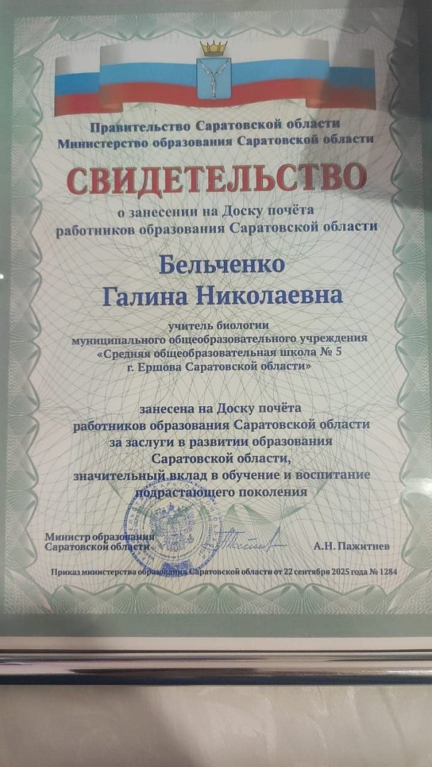 В октябре 2025 года в Саратове на областной Доске почета работников образования Саратовской области появилось новое фото. Фото учителя биологии школы №5 г. Ершова, советника директора по воспитанию Галины Бельченко. Сегодня о ней расскажет ее коллега Ирина Соловьева: