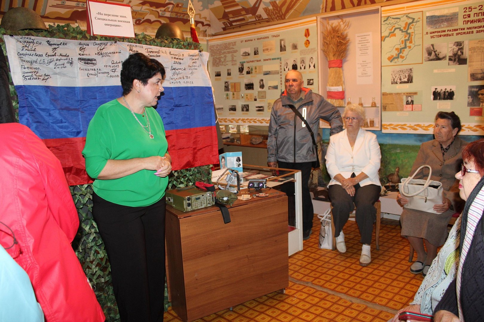 Первым делом экскурсовод и руководитель музея Елена Коровяковская вместе с пожилыми людьми вспомнили героев нашего края былых времен. После этого Елена Анатольевна перешла к демонстрации редких современных военных экспонатов, доставленных прямиком с поля боя, и, конечно же, рассказала о тех, кто сейчас находится на специальной военной операции, и о тех отважных бойцах, которые навсегда останутся с нами только в наших сердцах.