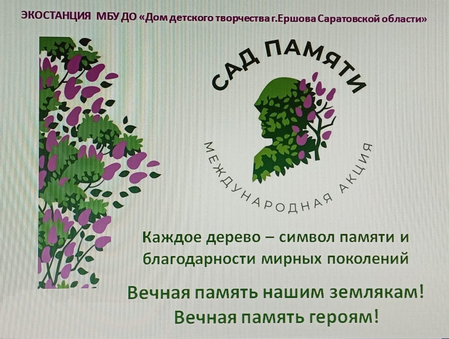 «Экостанция» Дома детского творчества г.Ершова стала участником международной акции «Сад памяти». У памятника «Пограничникам всех поколений» на аллее Пограничников произведена посадка саженцев рябины, берёзы, каштанов и сирени. Рядом с памятником высажены многолетние и однолетние цветы.