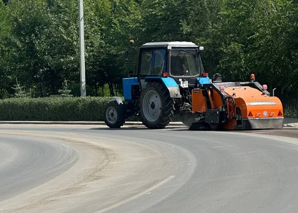 Сегодня, в тестовом режиме, машина вышла на улицы города. Аппарат представляет собой прицепное устройство к трактору. Он предназначен для подметания и очистки дорог, тротуаров и площадей от пыли и мусора.