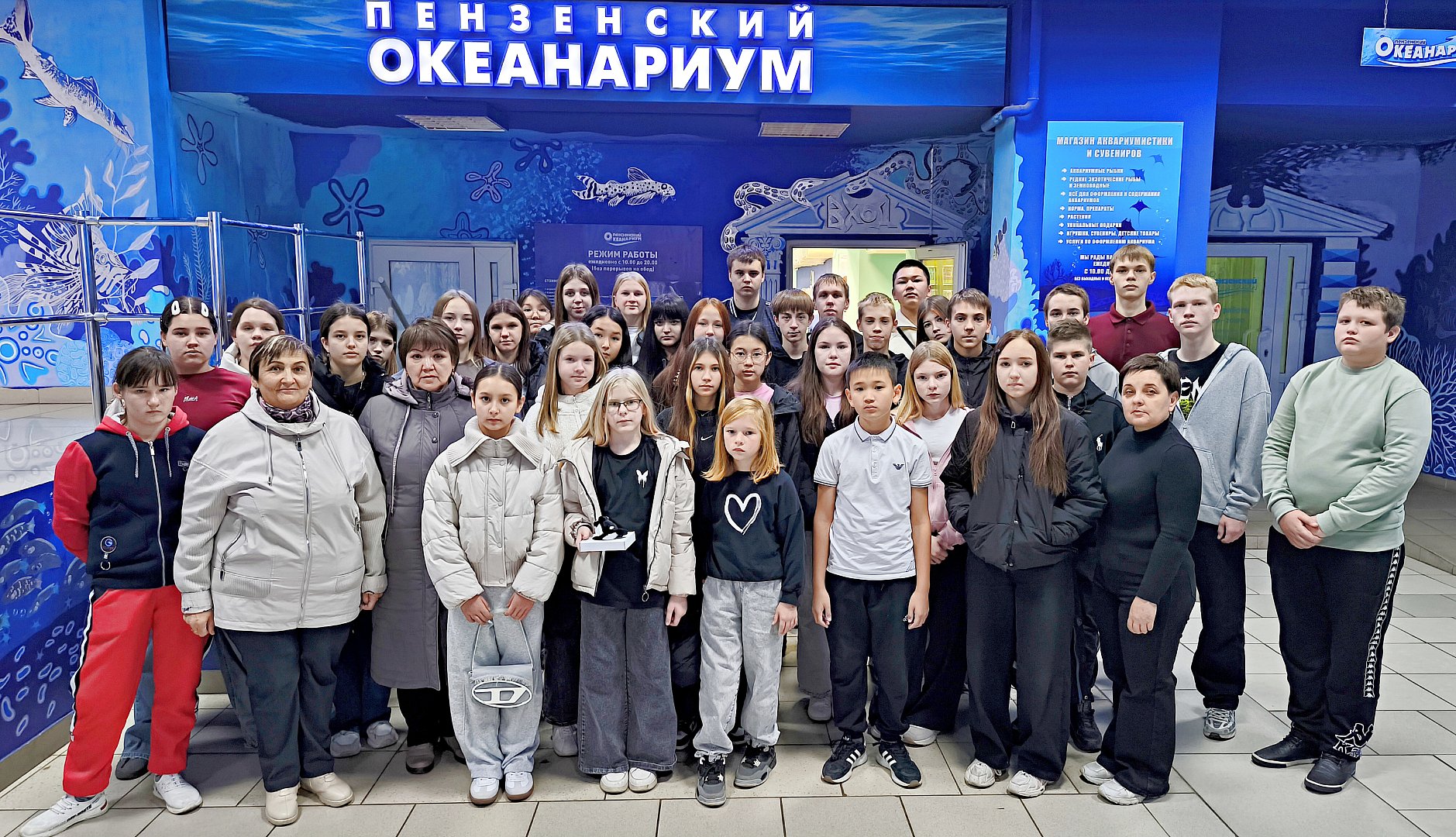 Далее, проехав по живописным улицам Пензы, ребята отправились на экскурсию в Пензенский океанариум, где их ждало увлекательное погружение в подводный мир. Океанариум занимает площадь в 3000 кв. метров. Общий объем всех аквариумов более 700 тонн воды. В океанариуме представлена эксклюзивная коллекция рыб: араваны, арапаимы, пираньи, электрические угри, скаты и другие редкие обитатели подводного мира Южной Америки, Азии, Африки, Индии. Множество больших аквариумов и открытых бассейнов содержат различных обитателей, начиная от безобидных черепашек и маленьких разноцветных рыбок и заканчивая пираньями и крокодилами. Есть здесь и акулы, а также другие подводные жители, привезенные в Пензу из Средней Азии, Африки, Америки.