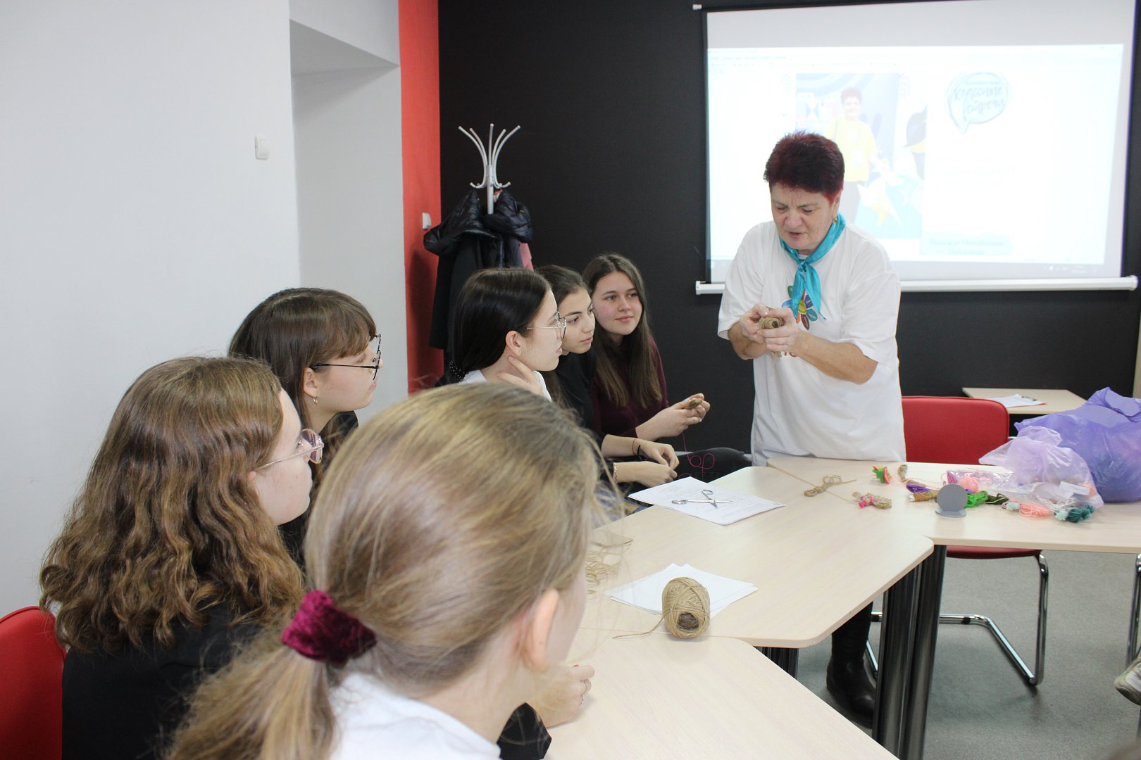 Надежда Михайловна поделилась впечатлениями об участии в 10-м молодежном форуме ПФО "iВолга" в Самарской области, о том, как она на протяжении нескольких лет занимается волонтерской деятельностью. Будущие волонтеры с интересом слушали, а потом приступили к мастер-классу по изготовлению оберега «Птица счастья».