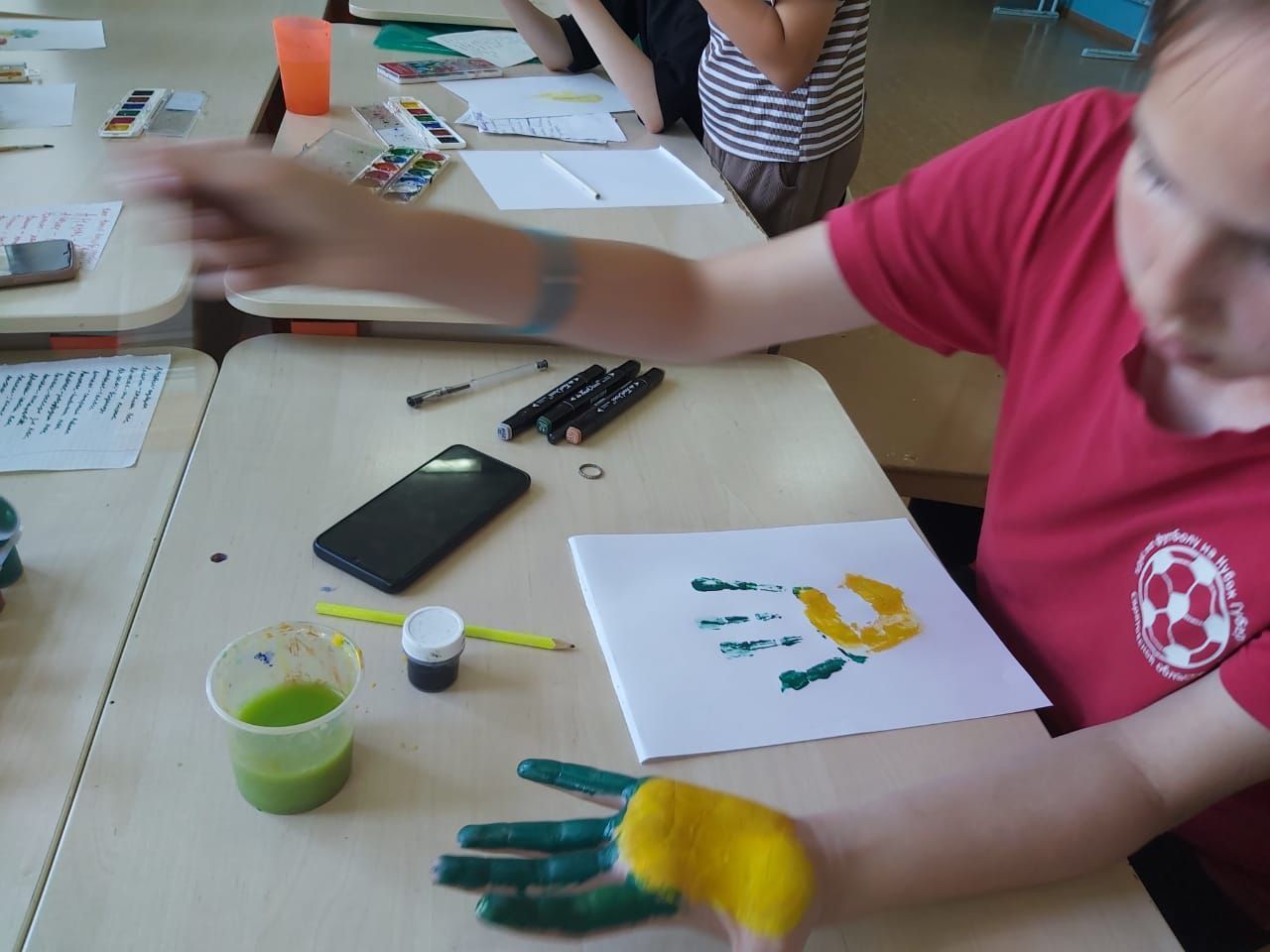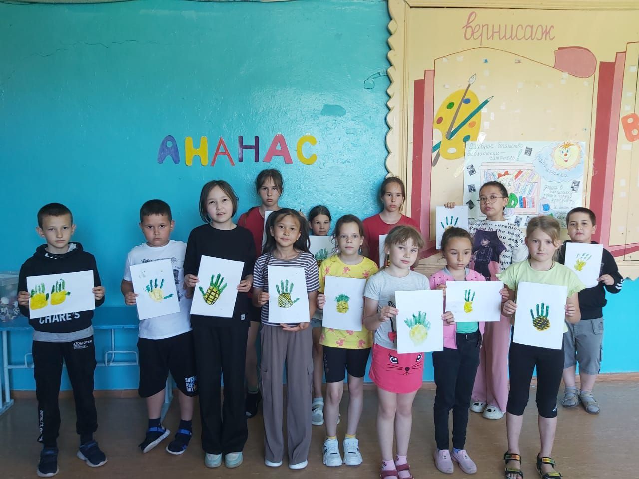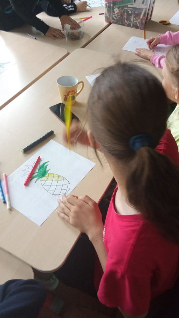 На днях в лагере был День ананаса, самого необычного фрукта, состоящего из маленьких сегментов-долек, крепко-накрепко связанных пушистой шапочкой. Ребята изобразили ананас на отдыхе, занимающегося спортом, используя разные техники - от традиционных красок до пальчиковой акварели.