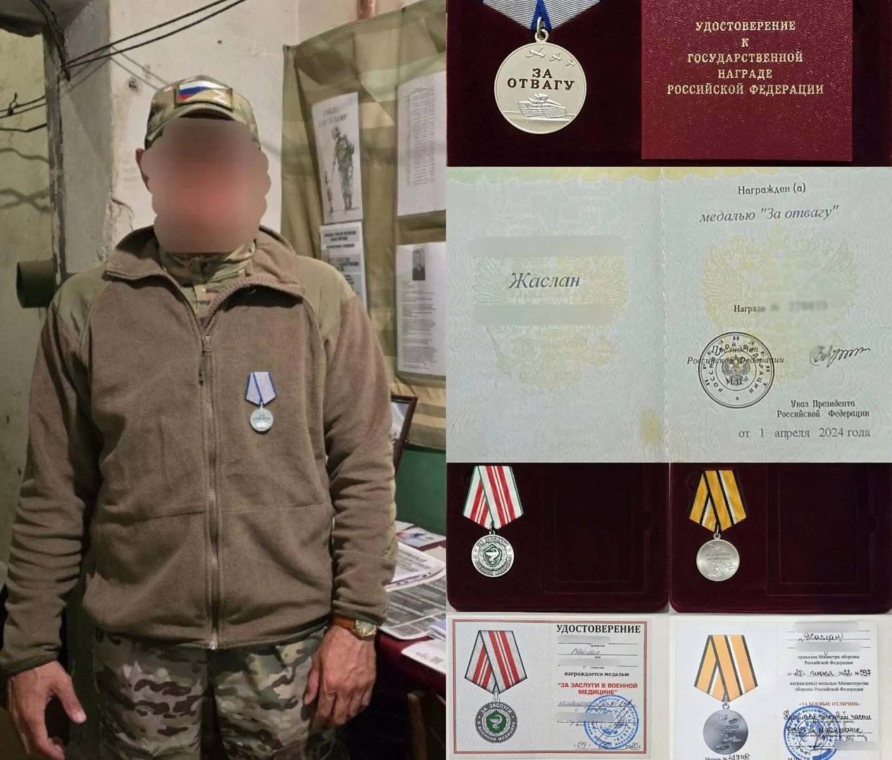 Жаслан служит по контракту с 2013 года и был награжден Нагрудным знаком «За службу на Кавказе», медалью «За заслуги в военной медицине». У военнослужащего много боевых наград, среди которых и медали, полученные за время СВО: медаль «За боевые отличия», медаль «За воинскую доблесть II степени», медаль «Участнику специальной военной операции».