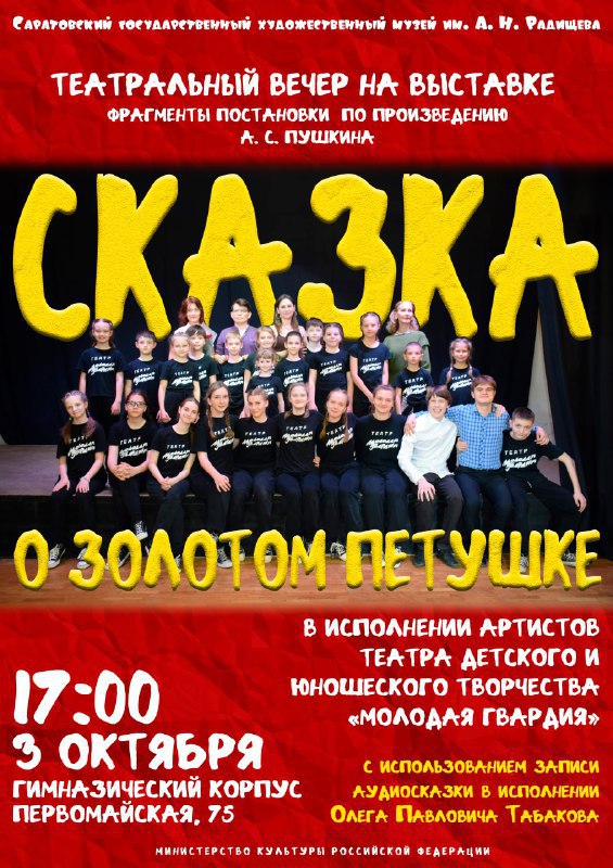 3 октября в рамках выставки «Олег Табаков. Настоящая жизнь» состоится показ фрагментов постановки Театра юношеского и детского творчества «Молодая гвардия» по произведению А.С. Пушкина «Сказка о Золотом Петушке». Фрагмент постановки погружает в атмосферу пушкинской сказки, помогает понять характеры героев. Особое место занимают озвученные Олегом Павловичем фрагменты сказки, которые прозвучат в спектакле.