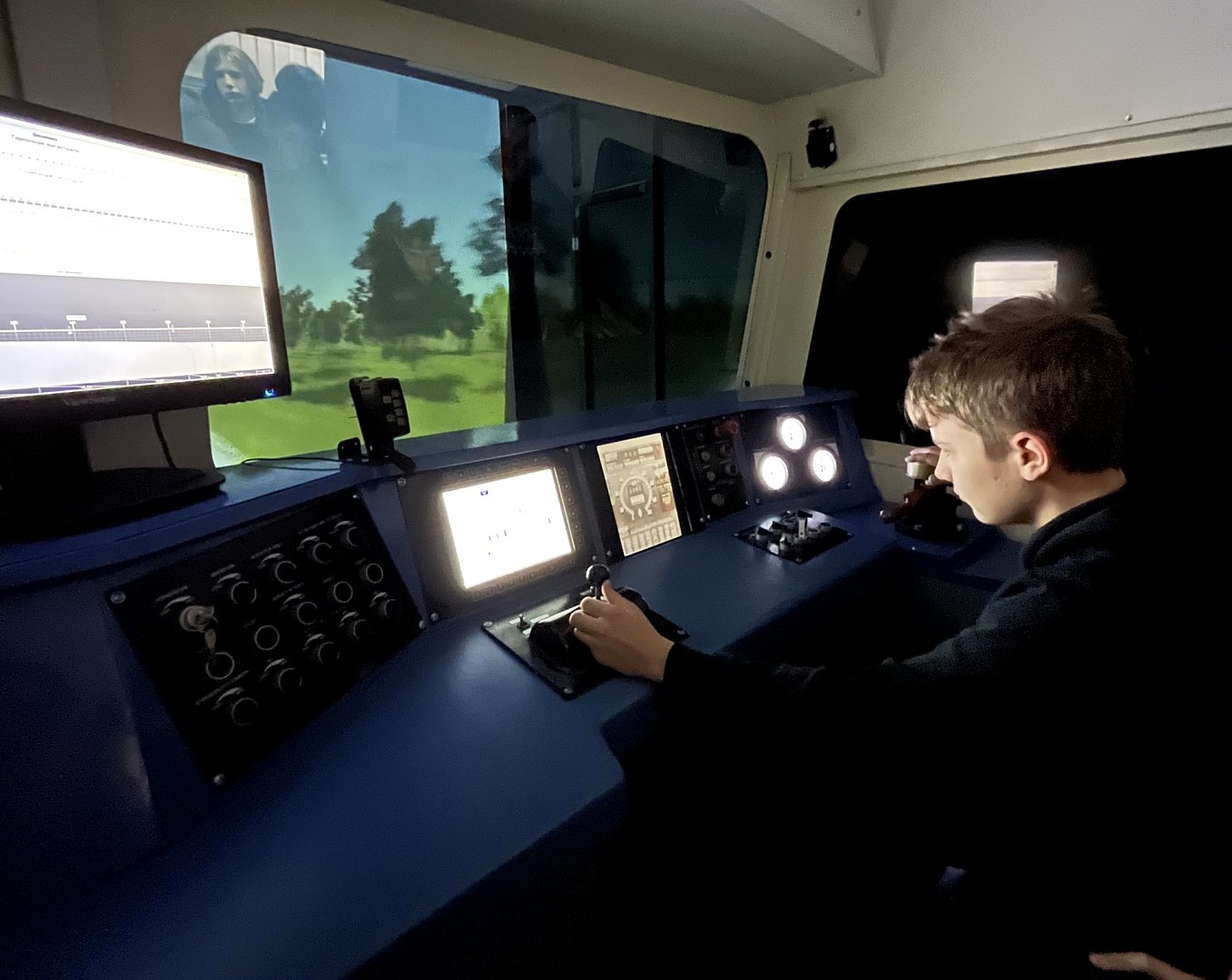 После этого экскурсия продолжилась в кабинете технической учебы. Здесь десятиклассникам показали тренажер — имитацию кабины локомотива, на котором машинисты отрабатывают различные рабочие ситуации. Ребята смогли увидеть, как проходят занятия и какое оборудование используется в обучении.