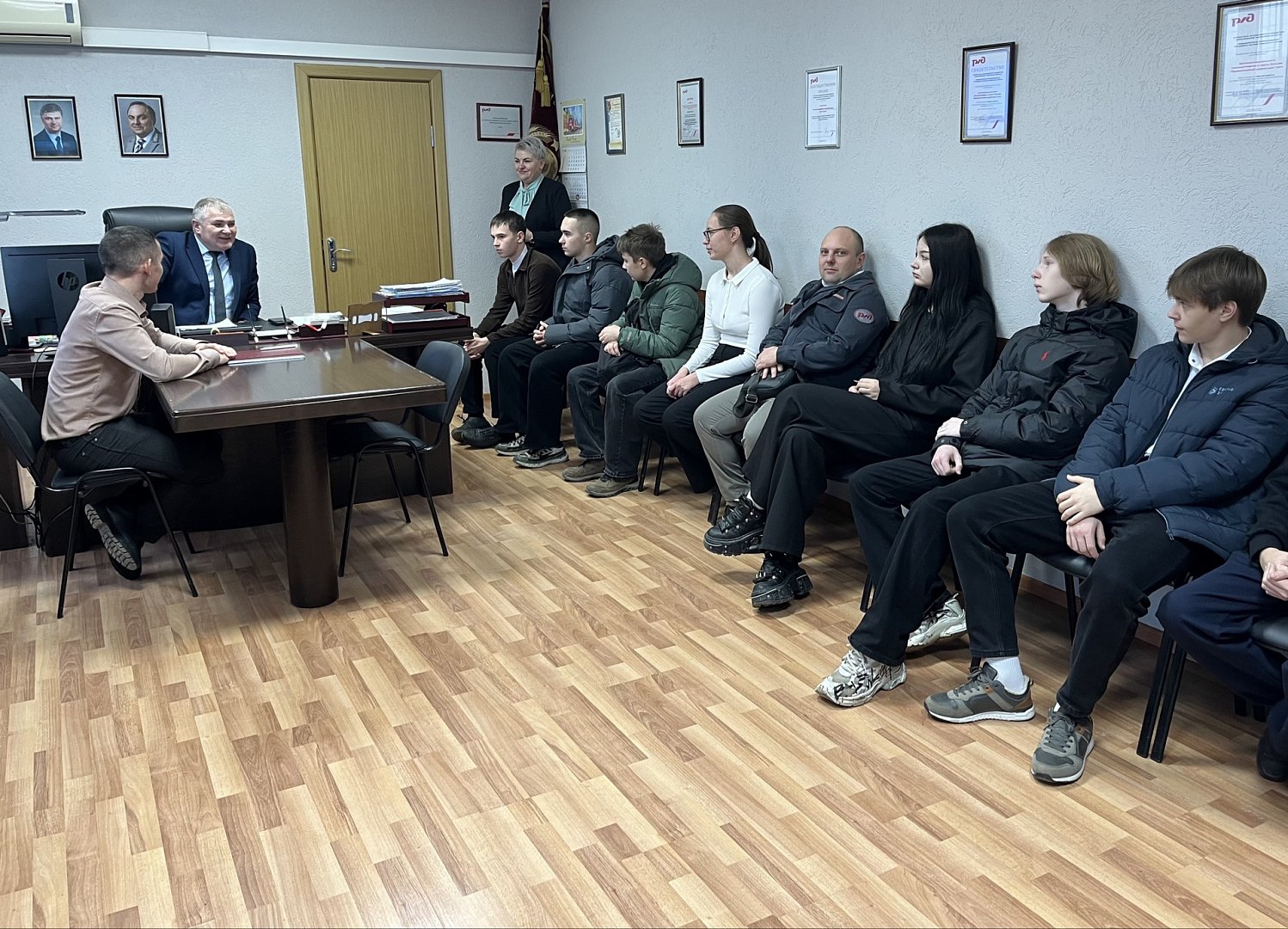 Затем школьников пригласили в кабинет начальника депо Ярослава Алешкина. Он рассказал гостям о железнодорожных профессиях, ступенях карьерного роста, образовательных учреждениях, где можно получить соответствующее обучение, а также о целевом направлении, особенностях проживания в бригадных домах и о работе депо изнутри.