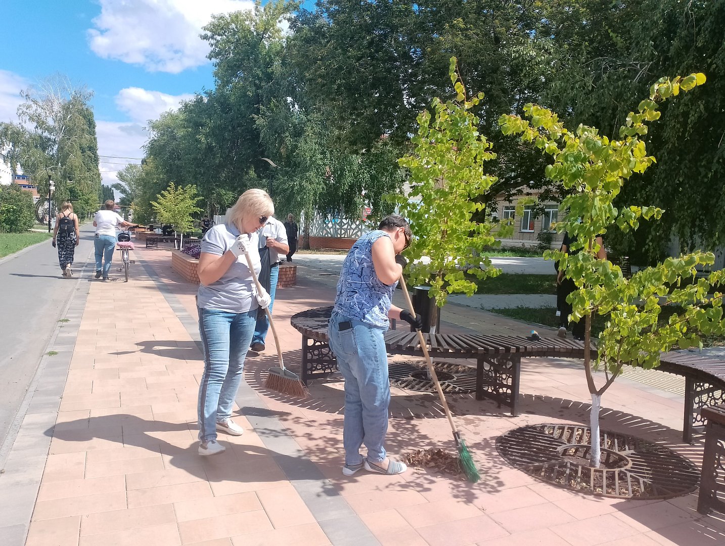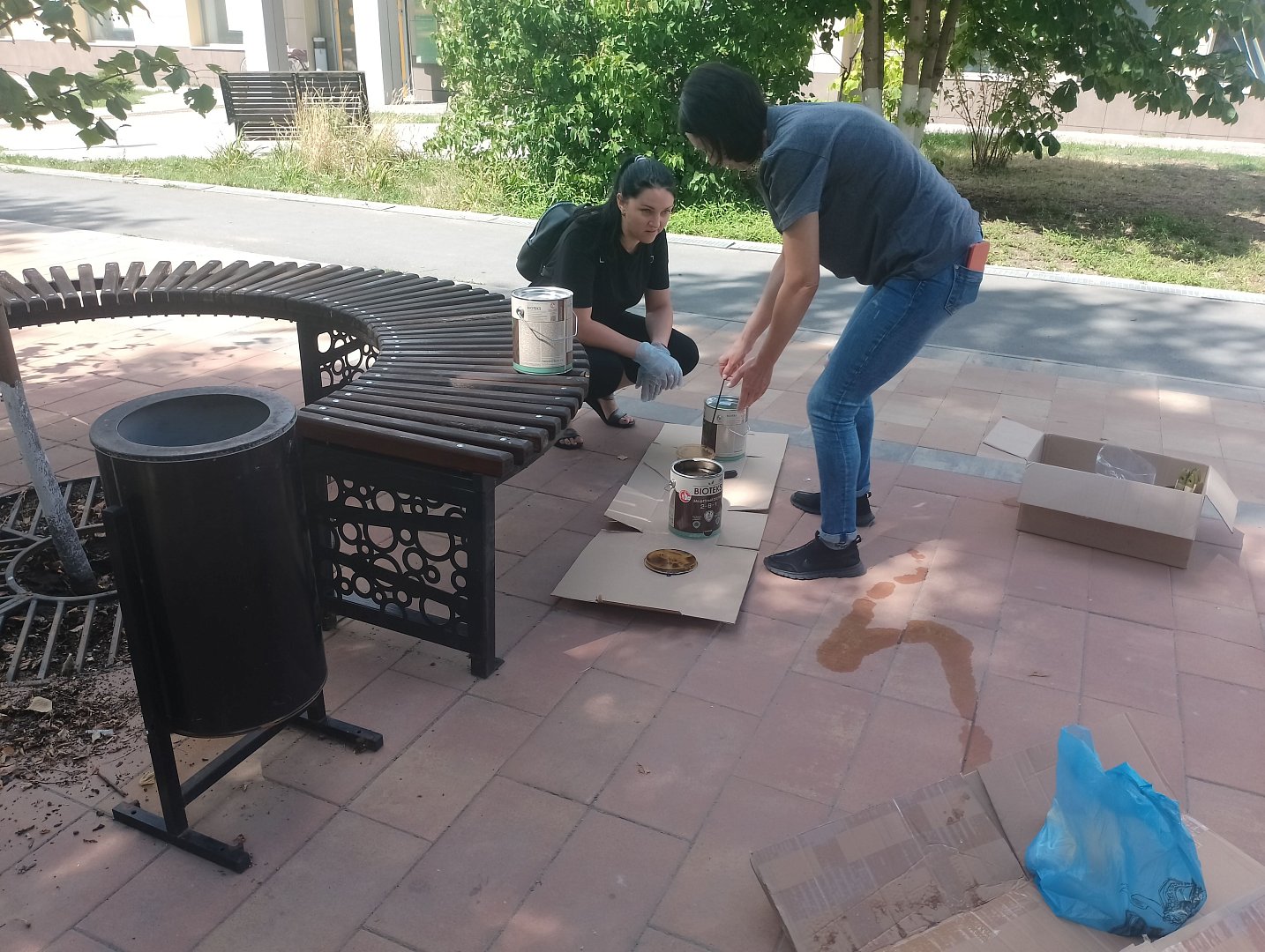 В пятницу, 9 августа, сотрудники районной администрации, финансового управления и службы ЕДДС сменили офисный дресс-код на рабочую одежду и вышли привести в порядок главную пешеходную зону города – ул.Интернациональную. Помимо уборки мусора, сухой травы и уже начавших кое-где опадать листьев, было запланировано обработать скамьи специальным составом, который не только декорирует деревянные фрагменты лавочек, но и служит защитой от атмосферных явлений, биологических повреждений и прочих неприятных для деревянных изделий неприятностей.