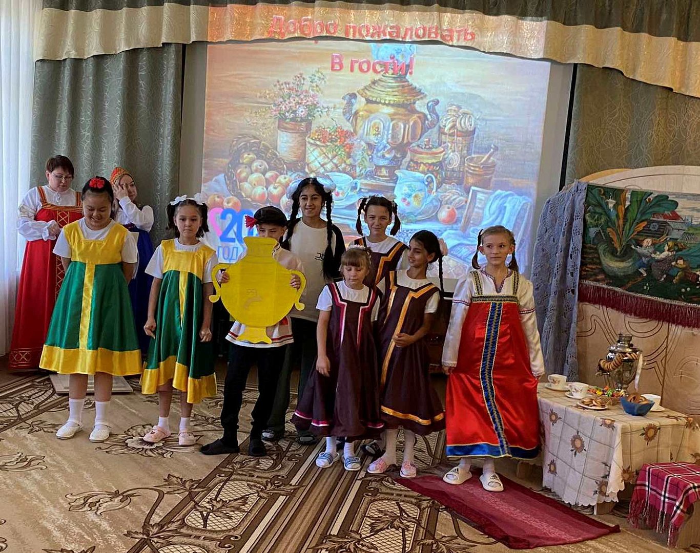 - Красочное фольклорное мероприятие подготовлено в ходе реализации проекта «Моя семья – мое богатство». Ребята познакомились с историей появления самовара на Руси, с традициями чаепития. Также наши юные артисты поучаствовали в театрализации «В гости всех к себе зовем и чайку потом попьем».