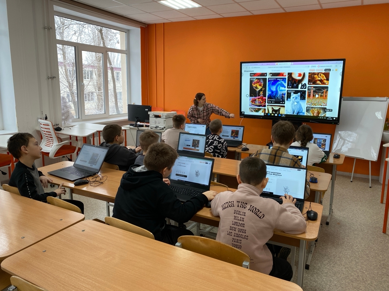 Мастер-класс начался с краткой лекции о том, что такое нейросети и как они работают. Ребята узнали, что эти алгоритмы способны генерировать изображения на основе текстовых описаний, а также обрабатывать и преобразовывать существующие картинки.