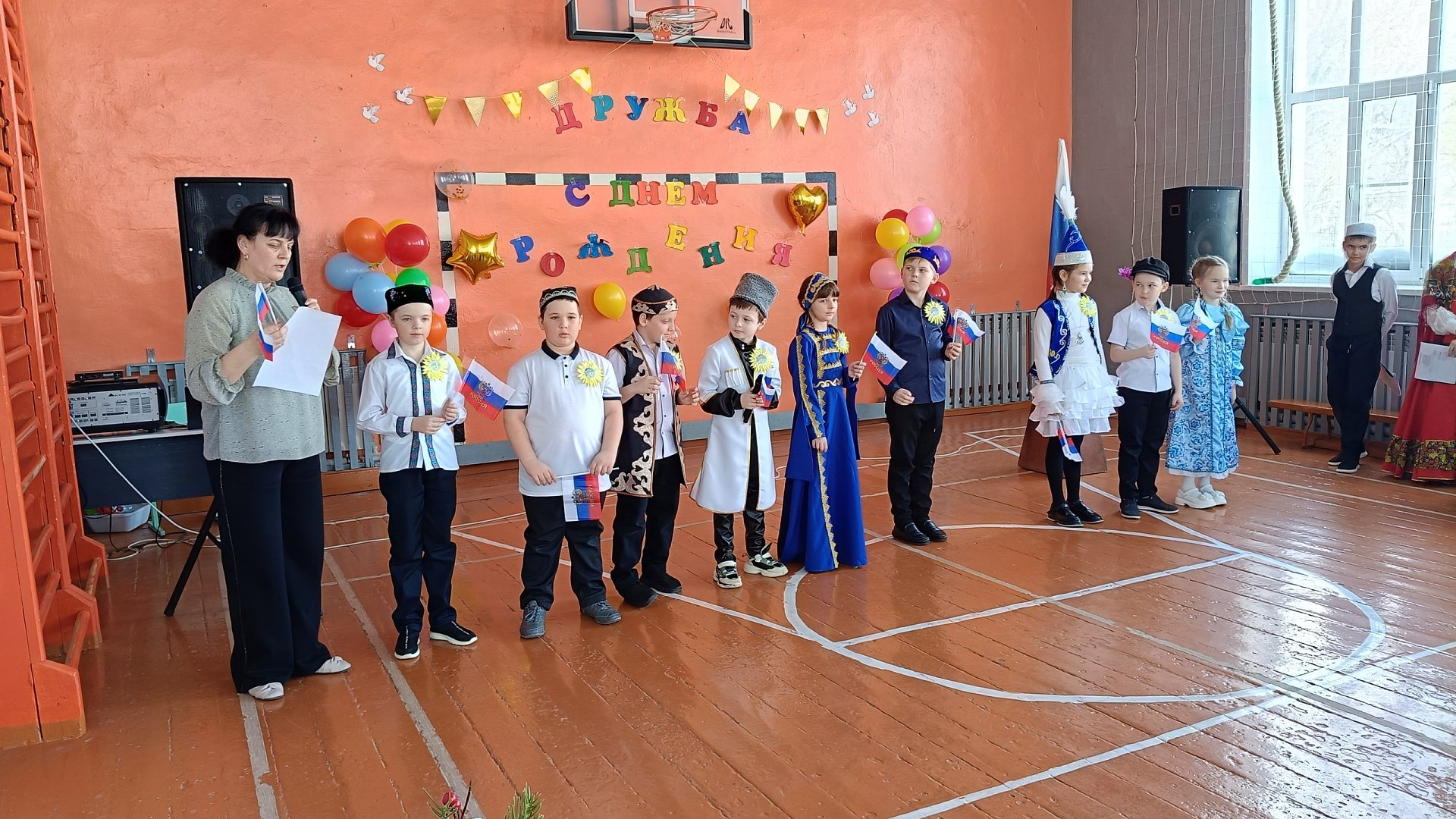 Открыла мероприятие приветственным словом и. о. директора Лариса Ямочкина. После ее выступления сцена буквально ожила. Учащиеся всех классов подготовили невероятно яркие и разнообразные номера, демонстрируя богатство культурного наследия нашей страны. Звучали народные и современные песни, исполнялись зажигательные танцы в красочных национальных костюмах, а миниатюры погружали зрителей в традиции разных народов России. Каждый номер был не просто выступлением, а искренней данью уважения к многообразию культур, которые делают нашу страну такой уникальной.