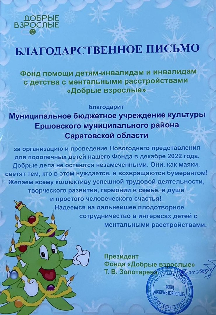 В пятницу, 23 декабря, в РДК г. Ершова состоялось новогоднее представление для детей-инвалидов и инвалидов с детства с ментальными расстройствами. Организатором праздника для детей стал Фонд помощи детям-инвалидам «Добрые взрослые».