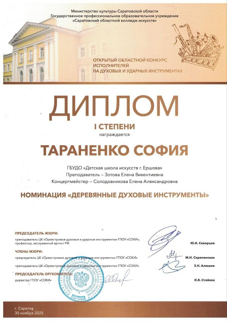 София Тараненко (кларнет) - Диплом l степени, преподаватель Елена Зотова, концертмейстер Елена Солодовникова.