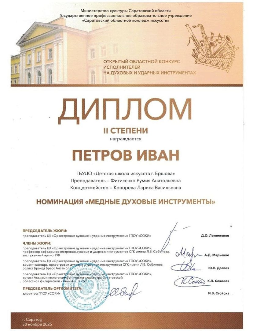 Иван Петров (труба) - Диплом lI степени, преподаватель Румия Фитисенко, концертмейстер Лариса Конорева.