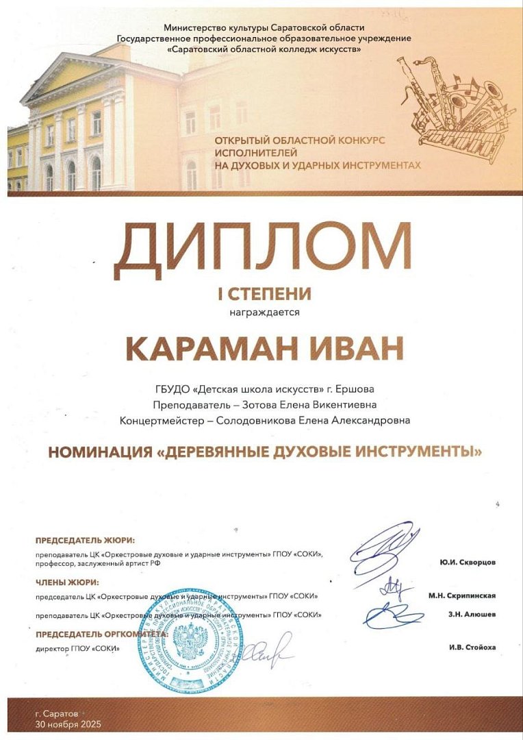 Иван Караман (саксофон) - Диплом l степени, преподаватель Елена Зотова, концертмейстер Елена Солодовникова.