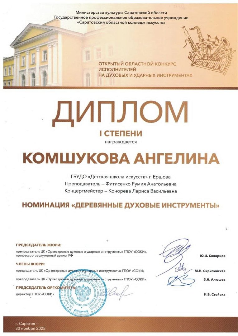 Ангелина Комшукова (флейта) - Диплом l степени, преподаватель Румия Фитисенко, концертмейстер Лариса Конорева.