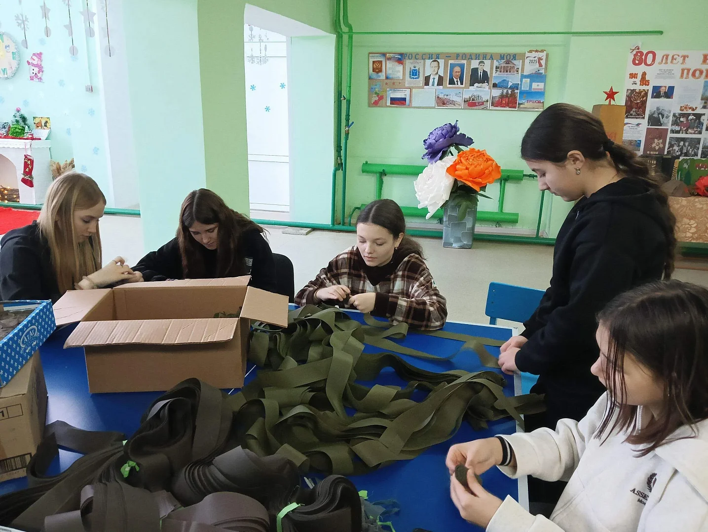 Активно подключилась к этому важному делу и молодежь. Сворачивая ленточки, они не только помогают создавать маскировочные сети для бойцов, но и участвуют в деле, которое становится символом единства и мужества нашего народа.